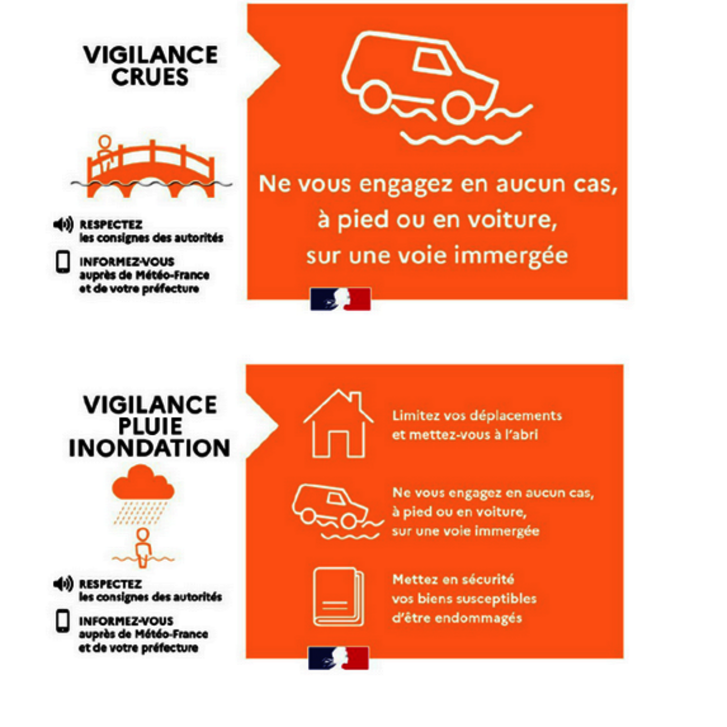 - Je m’éloigne des cours d'eau et des ponts, je rejoins un point haut ou je m’abrite à l'étage