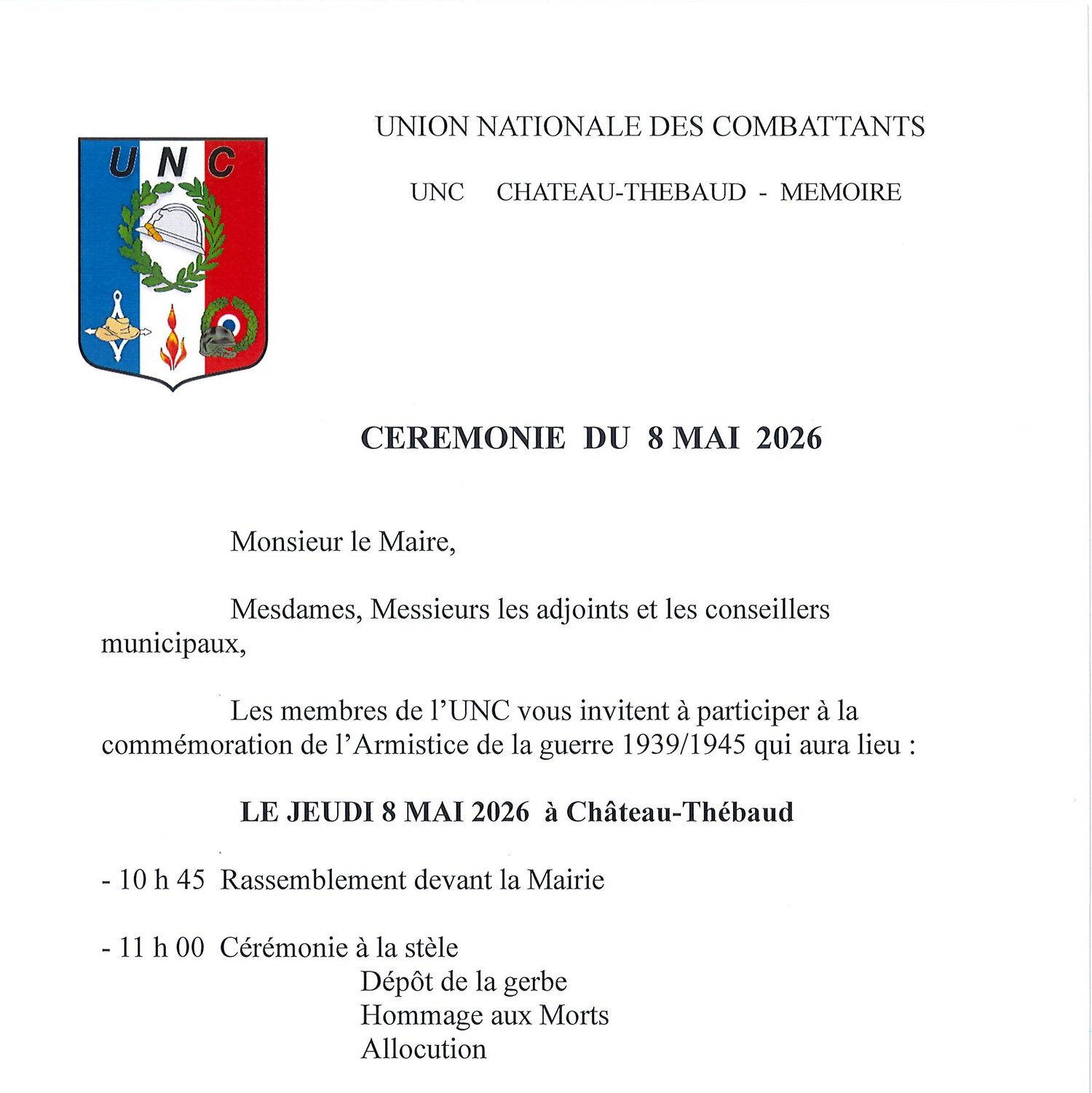 Vous invitent à la cérémonie commmémorative de l'Armistice de la guerre 1939/1945 le 8 mai prochain.